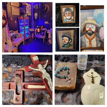 Everything from Antique uranium glass to vintage religious items.. gothic vintage clothing, and an entire circus of clowns!